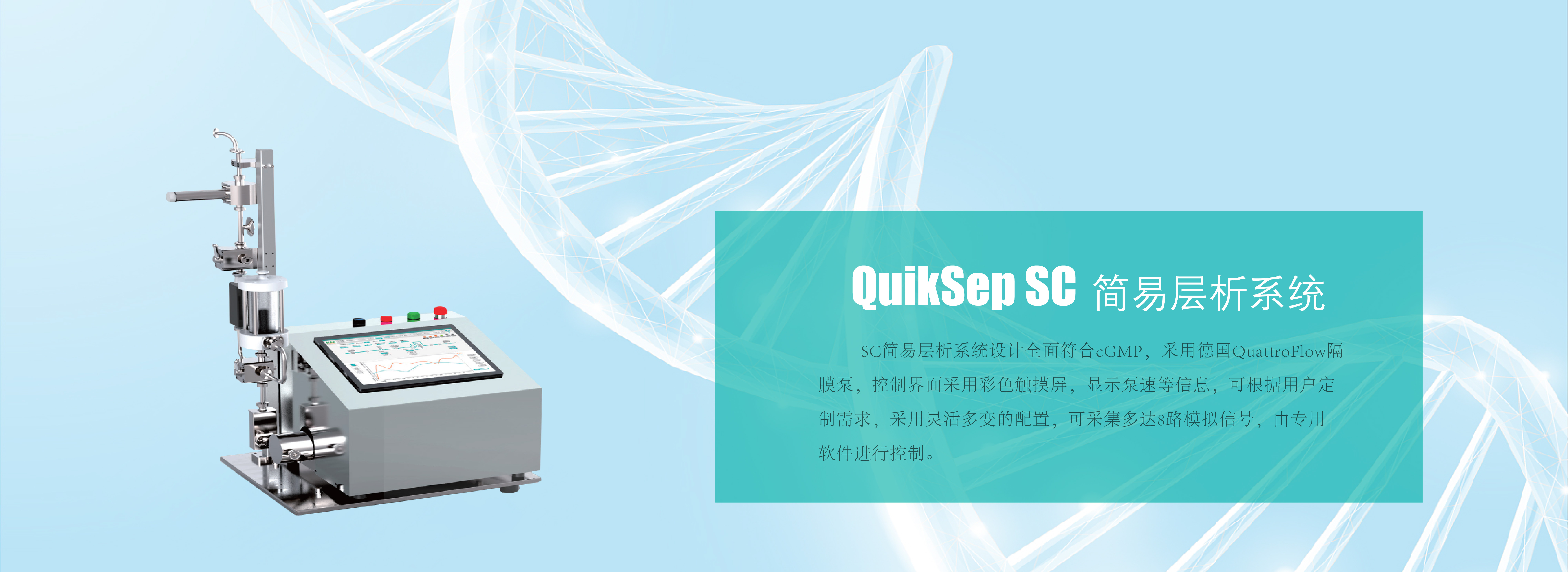 慧德易QuikSep SC簡易層析系統(tǒng)是采用衛(wèi)生級隔膜單泵設(shè)計,配合在線非接觸式超濾波流量計,可在線監(jiān)測流量、UV、電導(dǎo)、pH、壓力、溫度,手動柱位閥、氣泡陷阱閥為由衛(wèi)生閥門,是為中試和工業(yè)級生物制品純化而專門設(shè)計的層析系統(tǒng)