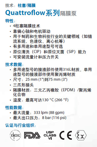 uattroflow的產(chǎn)品需要主要供應(yīng)于密封性好、純度高、無(wú)菌的制藥業(yè)和生物技術(shù)產(chǎn)業(yè)。Quattroflow的容積式泵產(chǎn)品采用無(wú)機(jī)械密封的四活塞隔膜技術(shù),該泵由一個(gè)偏心軸桿及發(fā)動(dòng)機(jī)驅(qū)動(dòng)。