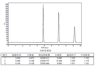 5. 良好的峰形對(duì)稱性:拖尾因子控制在0.95-1.20。6. 壓力適中,各種HPLC機(jī)器均能出色使用。