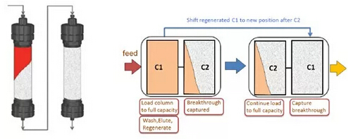 ? ? ? ?Capture SMB是將第一根層析柱的上樣流穿繼續(xù)上樣至第二根層析柱,待第一根層析柱完全滿載后,方結束其上樣,進行淋洗、洗脫等操作,而此時第二根層析柱仍在繼續(xù)上樣。通過切換柱位操作,保證2根層析柱的洗脫、再生、上樣等操作交替銜接進行,保證連續(xù)上樣,從而實現工藝與系統(tǒng)硬件設計的高度契合,使填料利用率最大化,用量大為縮減。