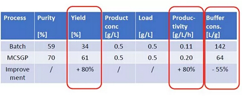 ? ? 有案例證明,MCSGP可將產品純度從傳統(tǒng)工藝的59%提升至70%,將收率從傳統(tǒng)工藝的34%提升至61%,從而使產量(g /L /h)整體提升80%,并同時使Buffer的消耗量降低55%。MCSGP工藝,無疑可顯著地節(jié)約成本投入,并可產生更多的生產效益。
