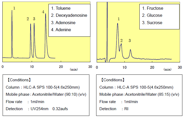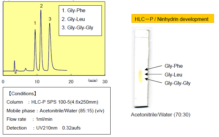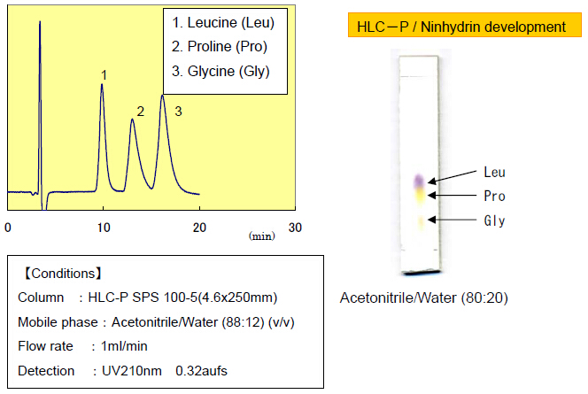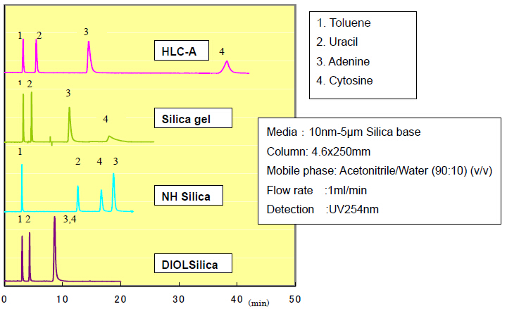 ????因此,對于極性化合物的洗脫,HILIC模式和反相模式是互補(bǔ)的。富士硅化學(xué)有限公司開發(fā)了兩款HILIC模式的填料,命名為“HLC”硅膠。兩種HLC硅膠都含有兩性的官能團(tuán),共價鍵合在硅膠表面。“HLC-A”用于分離純化有機(jī)酸、核酸和糖類;“HLC-P”用于分離氨基酸、多肽。