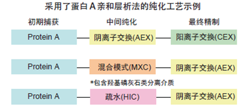 ??? 不采用蛋白A親和層析法的純化工藝可降低工藝成本??赏ㄟ^結(jié)合使用陽離子交換層析法 ( CEX ) 、陰離子交換 層析法 ( AEX )、疏水相互作用層析法 ( HIC ) 以及混合模式層析法 ( MXC ) 實(shí)現(xiàn)對(duì)單抗的高純度純化制備。