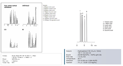 同時,SHODEX公司的KC-811柱和YMC公司的Hydrosphere C18柱,也能同時分離多種有機(jī)酸。