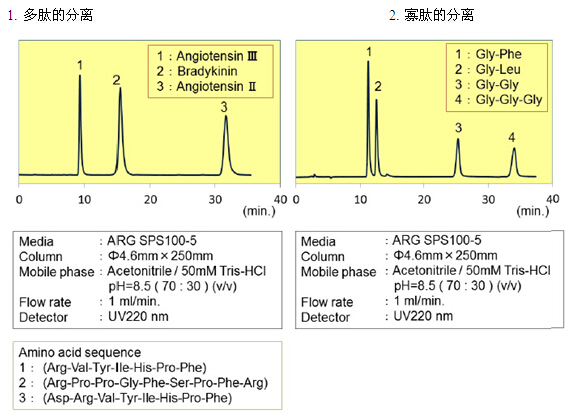 親水化合物一般是用反相模式來進(jìn)行分離,例如使用C18填料。但是,仍然有很多親水的化合物不能用普通的反相模式來分離。近些年來,HILIC模式的填料應(yīng)運(yùn)而生,特別適合分離親水性化合物(極性大的化合物)。富士硅化學(xué)有限公司開發(fā)了HILIC模式的“ARG硅膠”。ARG硅膠可用于分離氨基酸、多肽、維生素和核酸。不同粒徑的ARG硅膠可分別應(yīng)用于分析以及大規(guī)模的分離純化。
