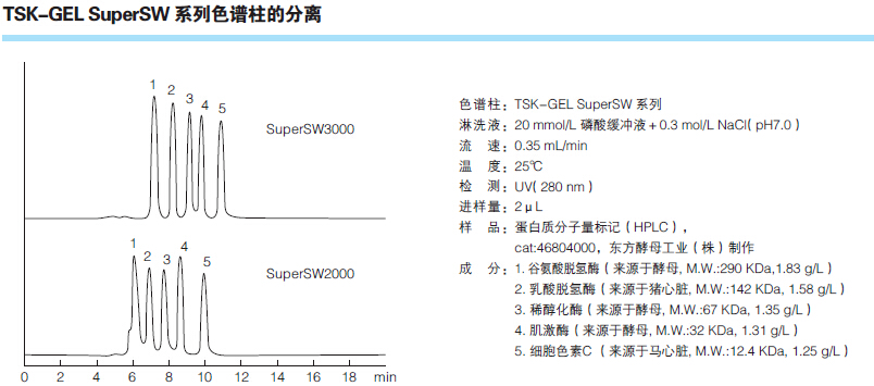3. TSKgel SuperSW柱有內徑為4μm的顆粒,能實現(xiàn)最高分辨率。窄至4.6mm內徑的柱能在一定量的樣品質量范圍內提高高靈敏度。