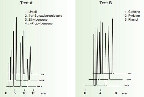上圖為三批填料測試結果的比較,其顯示了對疏水性、親水性、堿性及酸性化合物都具有優(yōu)良的分離再現(xiàn)性。