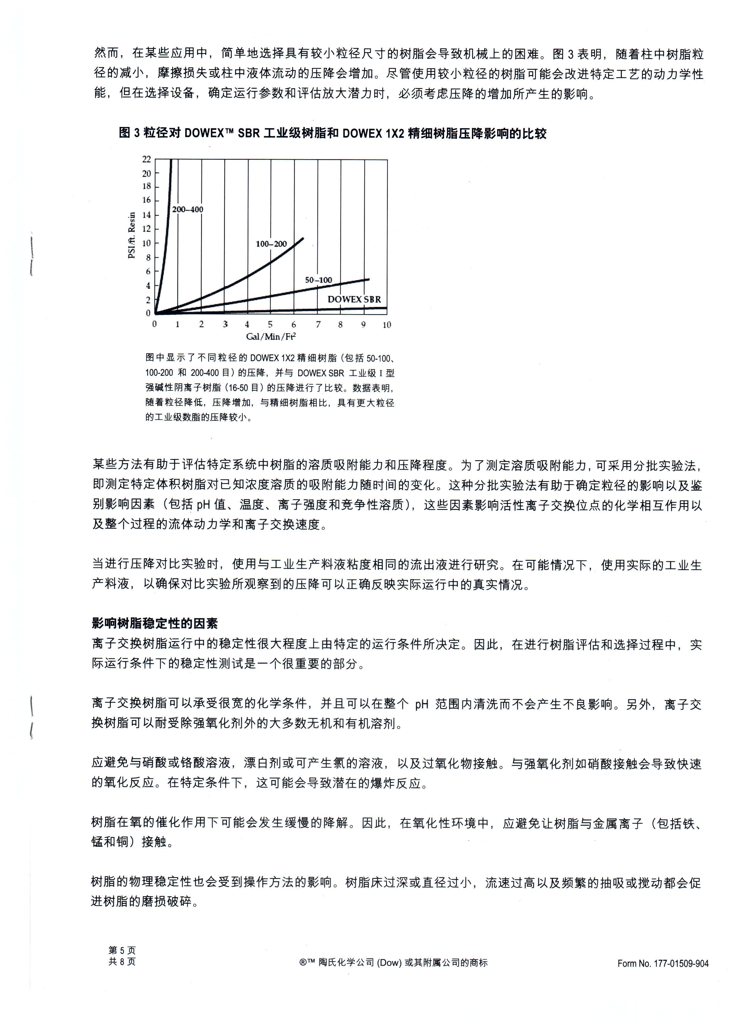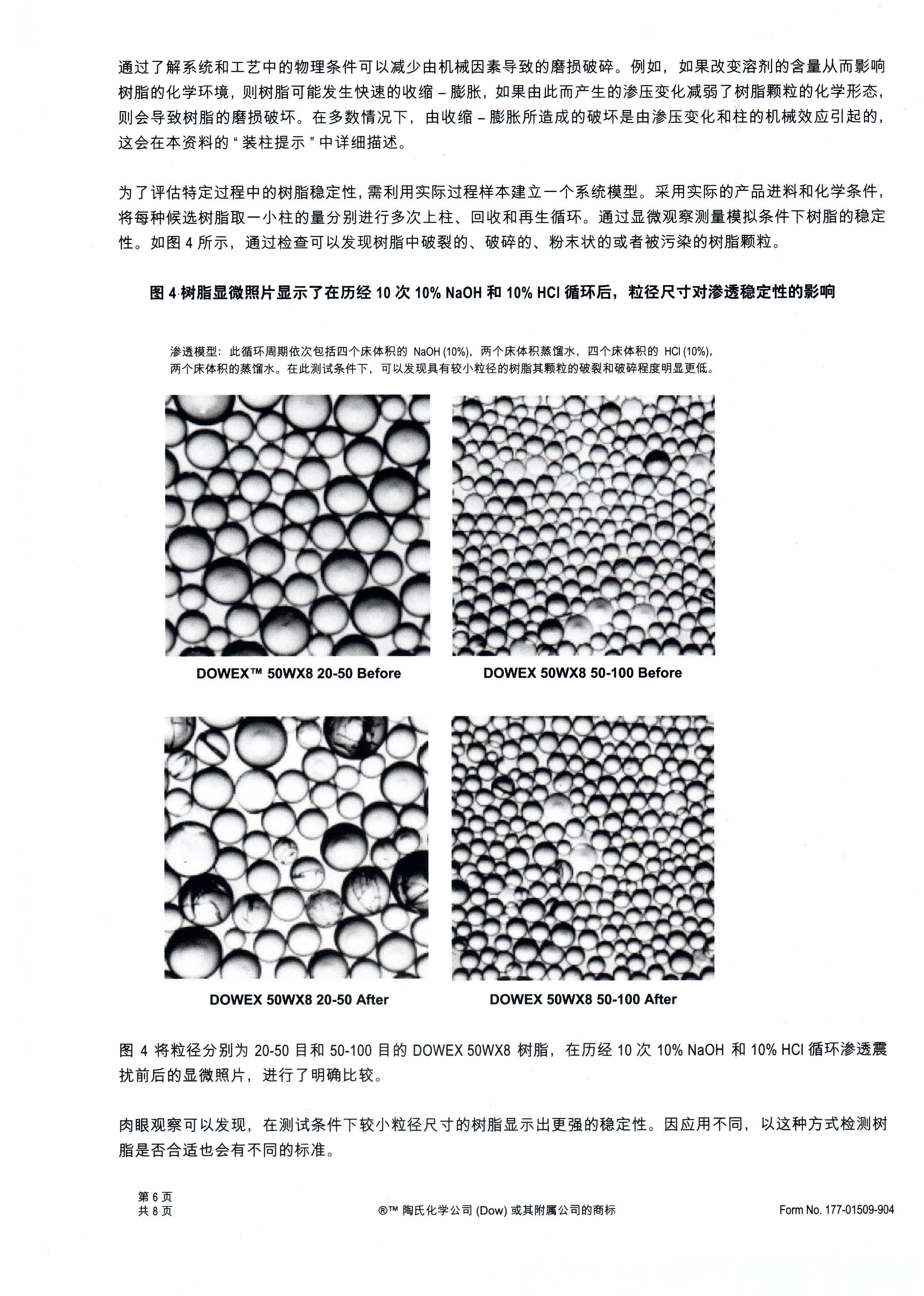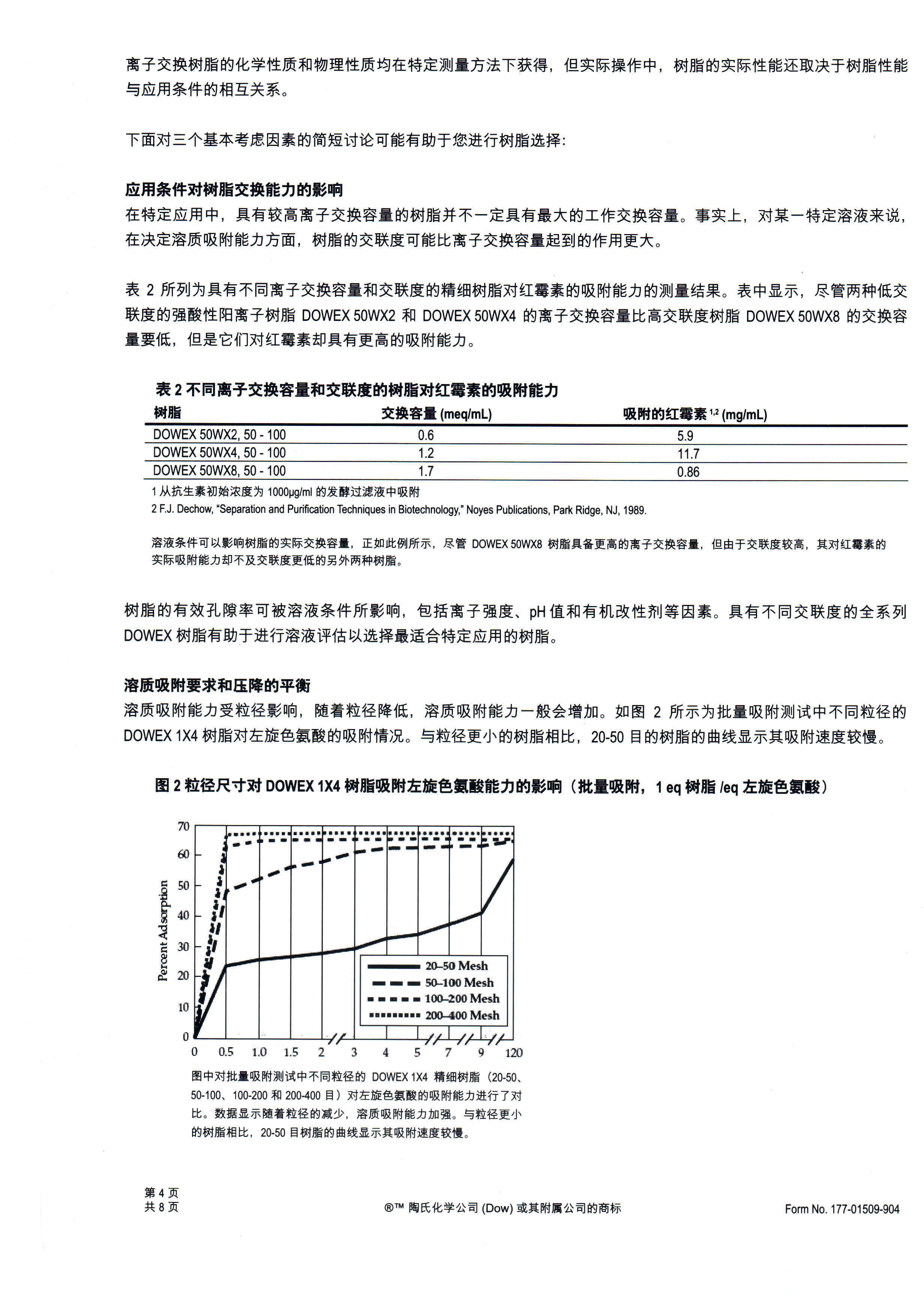 ?????? DOWEX系列離子交換色譜分離樹脂有強酸性陽離子交換樹脂和強堿性陰離子交換樹脂兩大類,每一類又根據(jù)交聯(lián)度(即DVB%)的不同劃分為3個小類,分別以“×2”、 “×4”與“×8”表示,在此基礎上進一步提供3個粒度范圍可供選擇,即150-300μm(50-100目)、75-150μm(100-200目)以及35-75μm(200-400目),共計18個樹脂牌號。顯然,不同交聯(lián)度的樹脂含水量不一,體積交換量、物質(zhì)擴散的阻力各異,如此寬泛的產(chǎn)品范圍豐富了客戶的試用選擇,可以針對具體的應用優(yōu)選出適宜的色譜分離樹脂。