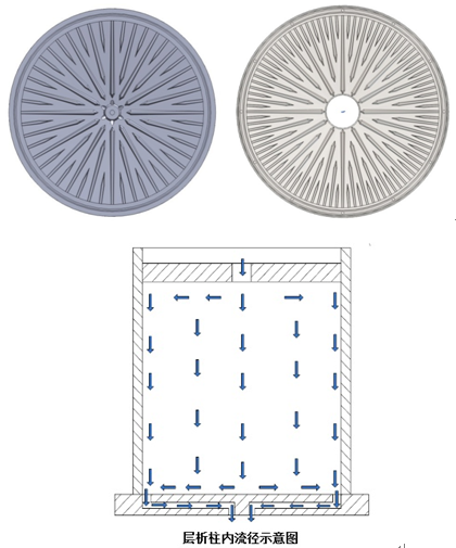 Fluid dynamic simulation, optimization design, reliability design, virtual design, three-dimensional modeling, and product life cycle design make the product performance have a single central nozzle and a guide runner. The nozzle for direct injection prevention is made together with the guide groove, which is positioned at the center of each unit to prevent the ejected liquid from directly entering the column without passing through the distributor. The patented distributor design ensures that all flow paths are of the same length, thus more effectively ensuring the distribution effect.