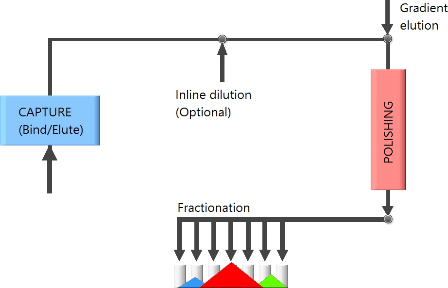 所有的Contichrom系統(tǒng)可以將兩個(gè)層析步驟(例如捕獲和精純)整合為一個(gè)單一的過(guò)程,第一步層析洗脫的產(chǎn)物可以直接被稀釋?zhuān)瑥亩苯舆M(jìn)行第二步層析,因此省略了中間的間歇過(guò)程,這是非常適用于高生產(chǎn)量純化的。