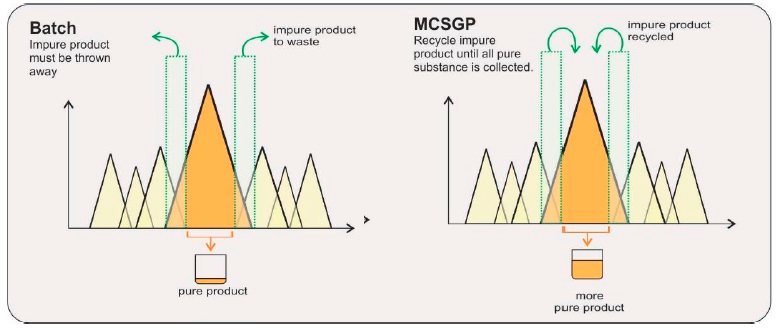 MCSGP工藝,可將含有不純組分的產(chǎn)品回收在一個(gè)封閉的環(huán)內(nèi),進(jìn)行循環(huán)式的層析操作,從而最大限度地提取純產(chǎn)品,使得收率和純度二者兼得。