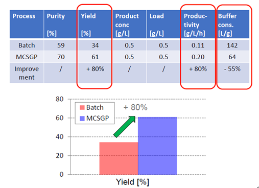 有案例證明,MCSGP可將產(chǎn)品純度從傳統(tǒng)工藝的59%提升至70%,將收率從傳統(tǒng)工藝的34%提升至61%,從而使產(chǎn)量(g /L /h)整體提升80%,并同時(shí)使Buffer的消耗量降低55%。MCSGP工藝,無(wú)疑可顯著地節(jié)約成本投入,并可產(chǎn)生更多的生產(chǎn)效益。