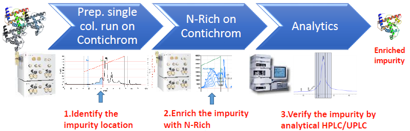 N-Rich工藝是微量物質(zhì)的富集過(guò)程,比如將產(chǎn)品的相關(guān)雜質(zhì)選擇性地富集在一個(gè)循環(huán)的層析過(guò)程中,待富集至目標(biāo)量,再進(jìn)行洗脫回收。該方法特別適用于分離與產(chǎn)品有關(guān)的雜質(zhì),如異構(gòu)體和聚集體,并同時(shí)用于發(fā)現(xiàn)研究。