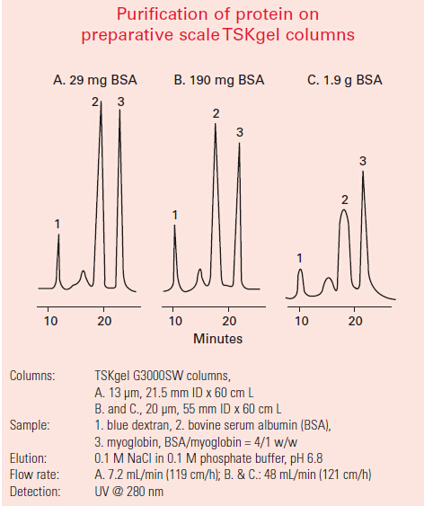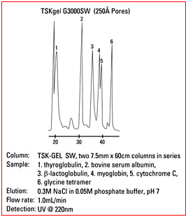 1. TSKgel SW-型填料由含二醇基官能團的剛性球形硅膠顆粒組成。