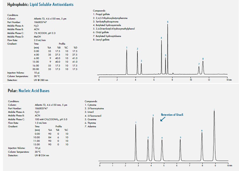 在對于極性化合物的反相HPLC保留與分離方面,Atlantis T3為極性化合物保留設(shè)立了行業(yè)標準。Atlantis T3色譜柱是通用的、硅膠反相C18柱,它不僅能保留和分離水溶性的極性小分子有機化合物,而且還為這項優(yōu)異能力提供了更寬的pH操作范圍。對于反相應(yīng)用,要開發(fā)極性(和非極性)化合物的保留分離方法時,Atlantis T3應(yīng)該作為第一選擇。